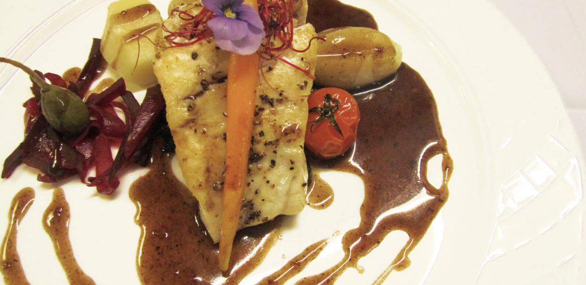 "Fish-Friend" rôti, velouté léger champagne-yuzu, pommes vitelottes, mignonnette de sésame au wasabi, asperges et fèves