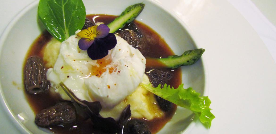 Asperges et morilles, jus corsé à l'arabica Blue Mountain, agrias sautées