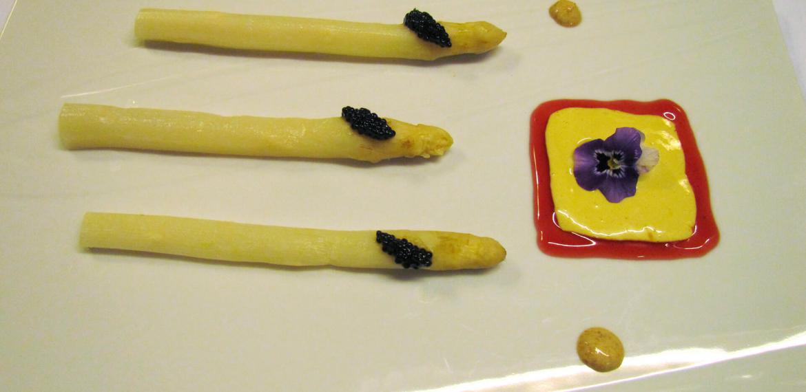 Asperges plancha, gelée de gingembre, huile vierge de mandarine, fumet de sa tête