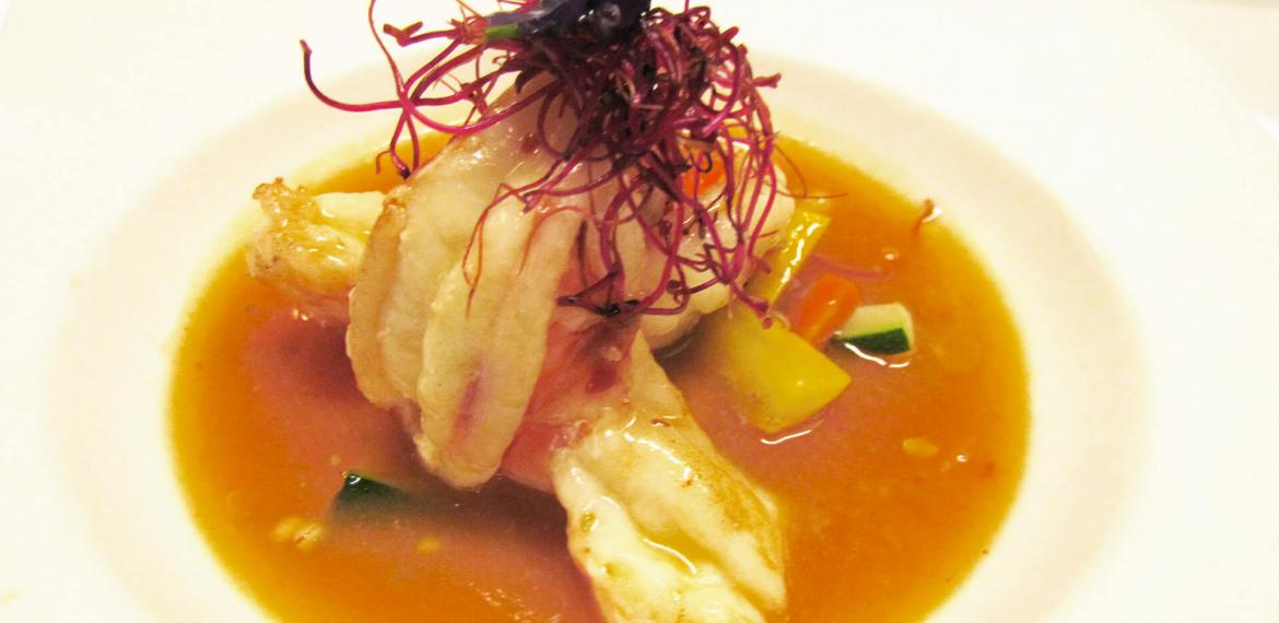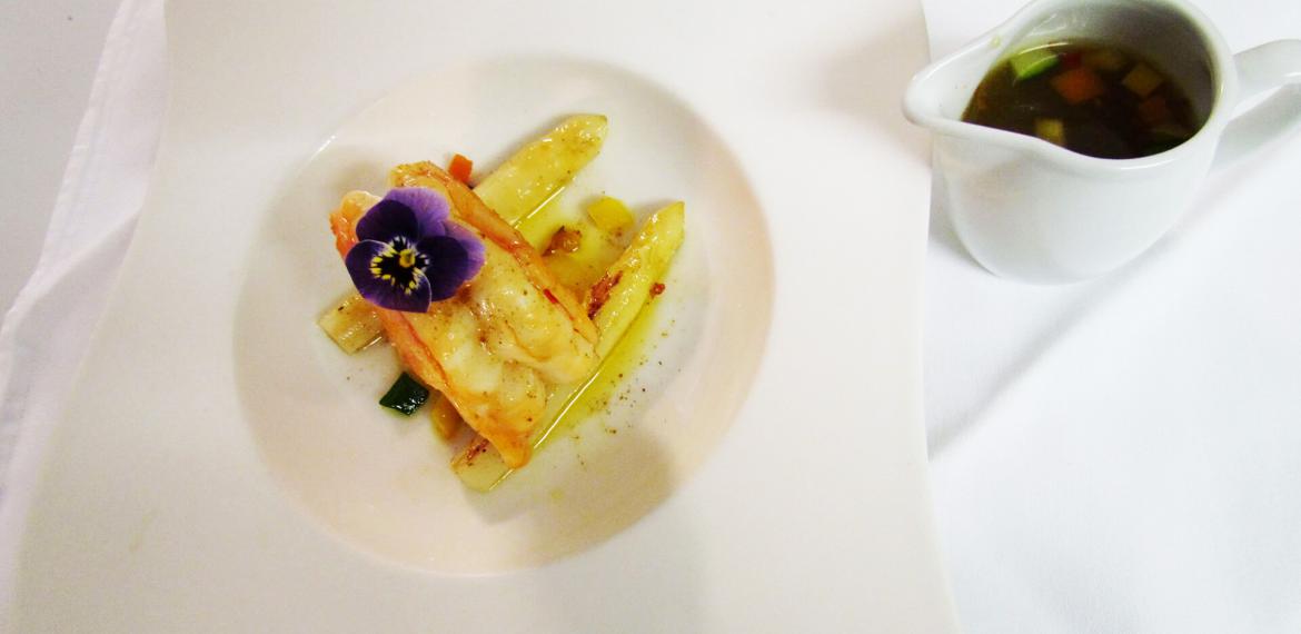 Asperges plancha, gelée de gingembre, huile vierge de mandarine, fumet de sa tête