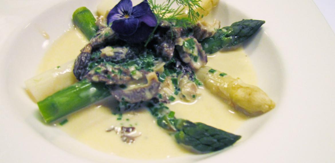 Asperges et morilles, jus corsé à l'arabica Blue Mountain, agrias sautées