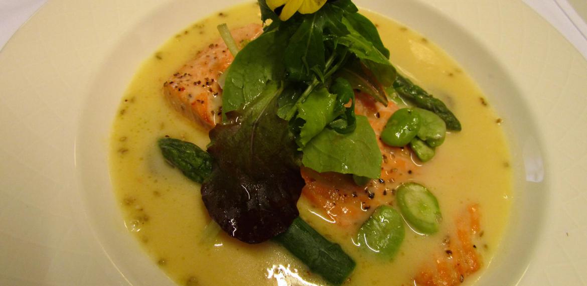 "Fish-Friend" rôti, velouté léger champagne-yuzu, pommes vitelottes, mignonnette de sésame au wasabi, asperges et fèves