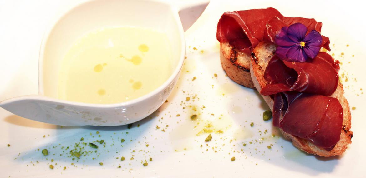 Vichyssoise tiède au topinambour, toast de pain grillé au jambon de cerf