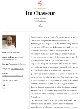 Nous sommes de passionnés de la gastronomie, formés dans la tradition et le compromis du métier et la mise en valeur de l'accueil. Les spécialités de notre Argentine native, la vraie parrilla (grill) au feu de bois dans l'esprit des maîtres "asadores de la Pampa", la cuisine créative de saison sans oublier bien entendu les filets de perches du Léman, les cuisses de grenouilles fraîches de Vallorbe, les meilleurs produits de proximité et bio. Produit-traçabilité-qualité et créativité